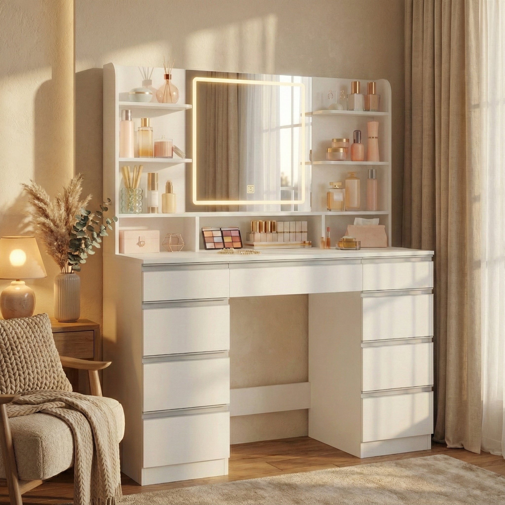 Cette coiffeuse apporte une sensation immédiate d’ordre et de clarté à votre chambre. Chaque compartiment trouve naturellement sa place dans un ensemble harmonieux. Un meuble pensé pour instaurer une atmosphère soignée et agréable au quotidien.