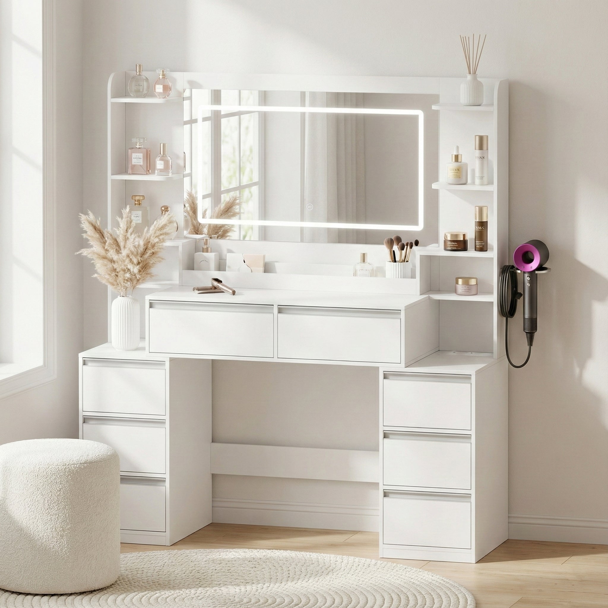 Cette coiffeuse structure votre chambre avec douceur et harmonie. Son miroir généreux et ses nombreux rangements créent un espace chaleureux, propice à vos moments de soin. Un meuble conçu pour embellir votre quotidien.