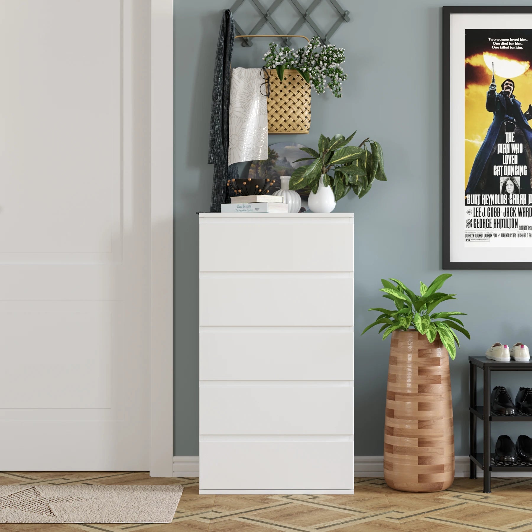 Une commode élancée à cinq tiroirs offrant un grand rangement vertical pour structurer votre chambre avec simplicité et harmonie.